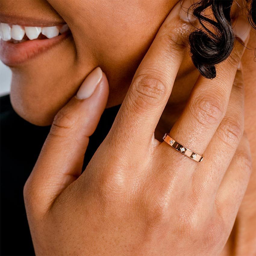 Round diamonds set in lotus-inspired impressions orbit the entirety of this band like shining, glamorous moons in this chic, captivating design (1/10 total carat weight).