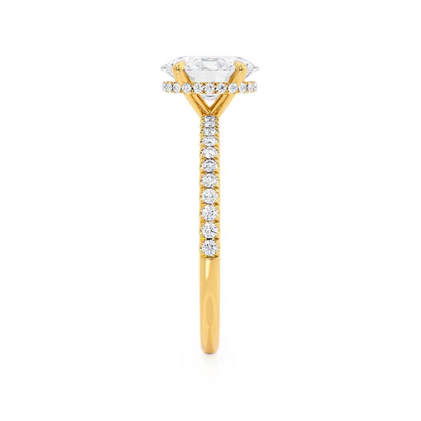 This incredible petite lab diamond shoulder set engagement ring features a dazzling hidden halo that can only be seen from the side profile of the ring. Crafted in luxurious 18K yellow gold this ring truly sparkles from every angle.