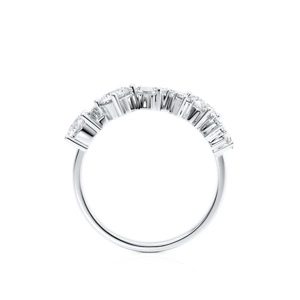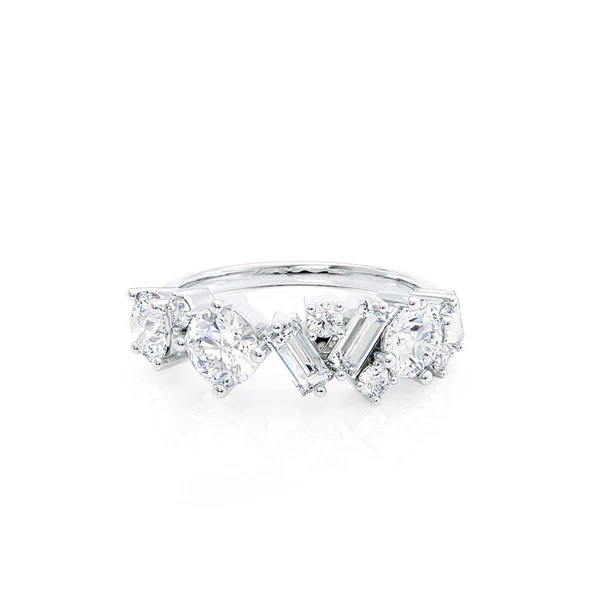 A delightful statement cluster ring, the Venus engagement ring gracefully partners with a variety of engagement rings or can be worn individually. The scattered arrangement of baguette and round lab diamonds provides a stunning variety of sparkle.